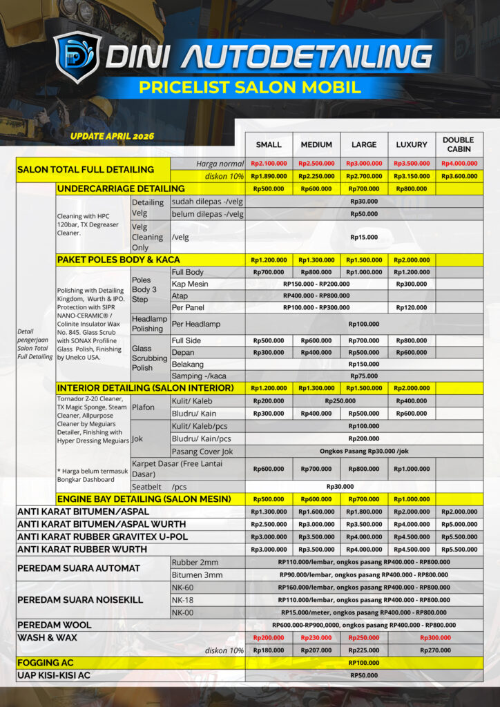 Salon Total Full Detailing: Mobil bersih maksimal, luar-dalam seperti baru! Bebas debu, kuman, dan hama. Kilau cat terjaga, mesin optimal. Nyaman dan aman dikendarai.